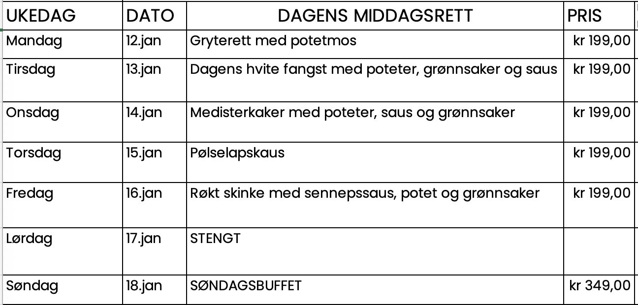 Hos oss får du servert deilige retter laget med kjærlighet og ferske råvarer. Enten du er på jakt etter en koselig lunsj, en hyggelig middag, eller bare en god kopp kaffe eller kake, har vi noe for alle.